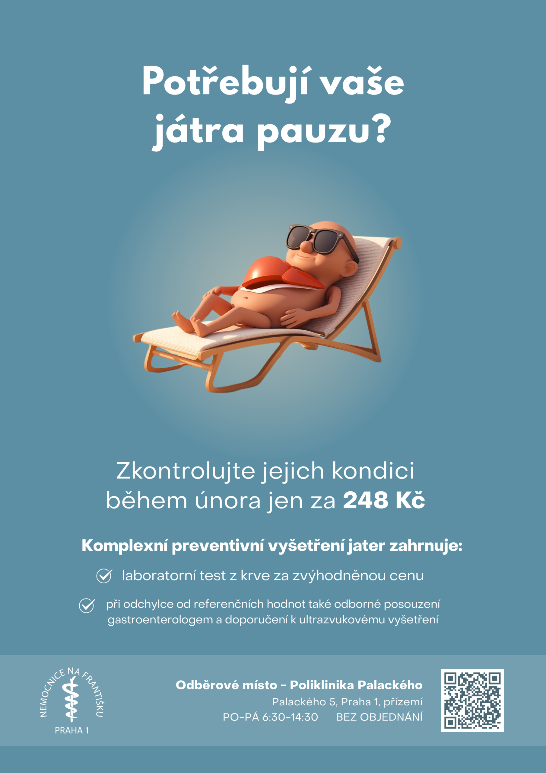 Nemocnice Na Františku se v únoru 2026 připojuje k osvětové iniciativě Suchej únor, která vyzývá k měsíční pauze od alkoholu a podpoře zdravějšího životního stylu. V rámci této preventivní aktivity nabízí nemocnice možnost komplexního vyšetření jater se zaměřením na včasné odhalení rizika jaterní fibrózy. Laboratorní vyšetření je nyní za zvýhodněnou cenu 248 Kč.